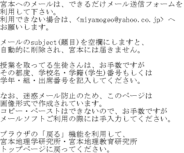 私は、1993年より北海道で地理学の研究活動・教育活動を行ってきましたが、2010年度より茨城県で高校の教員となりました。これにともない、ホームページのタイトルも、「宮本地理学研究所」から「宮本地理学研究所・宮本地理教育研究所」と変更しました。(茨城県在職中には日本史・世界史を担当することが多かったのですが、2013年4月からは埼玉県の教員となり、やっと地理を中心に担当できるようになりました。)宮本への連絡用メール送信フォームは引き続きご利用下さい。また、全国の地理学・地理教育関係者にも、このページで取り上げた文献や授業等に関してアドバイスをいただきたく思っております。なお、本ページには写真や図がないどころか、色使いもなく、殺風景に思う方もいるかもしれません。しかし、軽くて見やすいこと、印刷しやすいこと(インクの節約)を優先しています。ご理解願います。